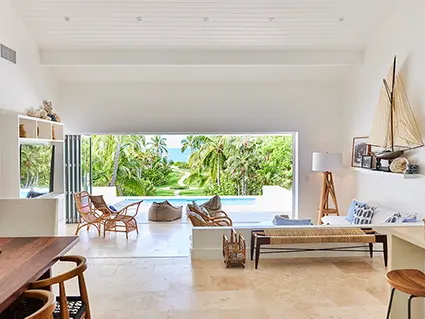 Pink Sands House is our 1-bedroom villa which is perfect for romantic getaways or honeymoons, offering exceptional privacy and, at 1200 sq ft, plenty of space for two with a large open plan living and dining room with its own kitchen and a beautiful pink bedroom with rattan four poster bed, handmade for us in Indonesia. The bedroom looks out over a private veranda to a gazebo with hammock and beyond to the exquisite ocean.